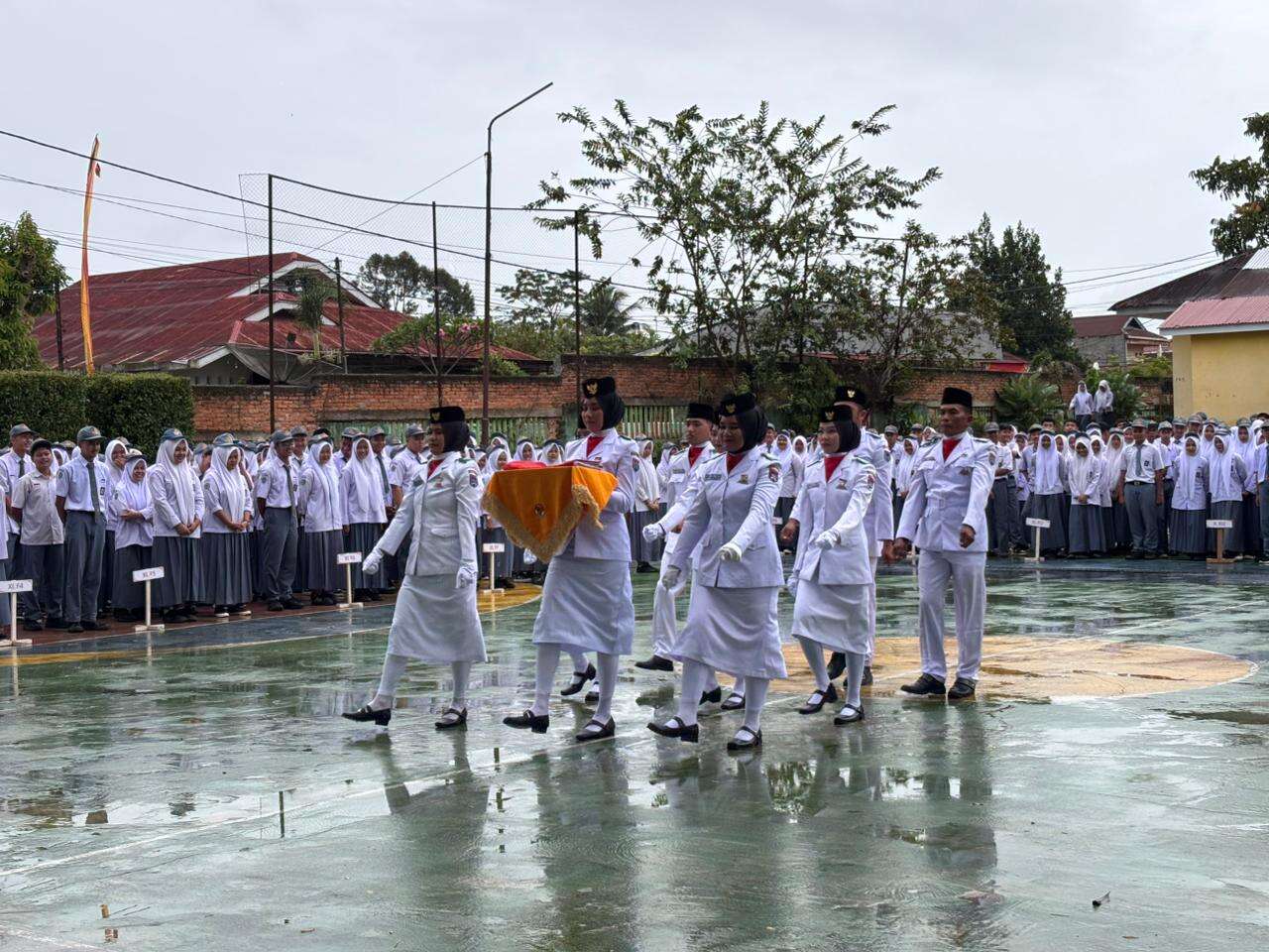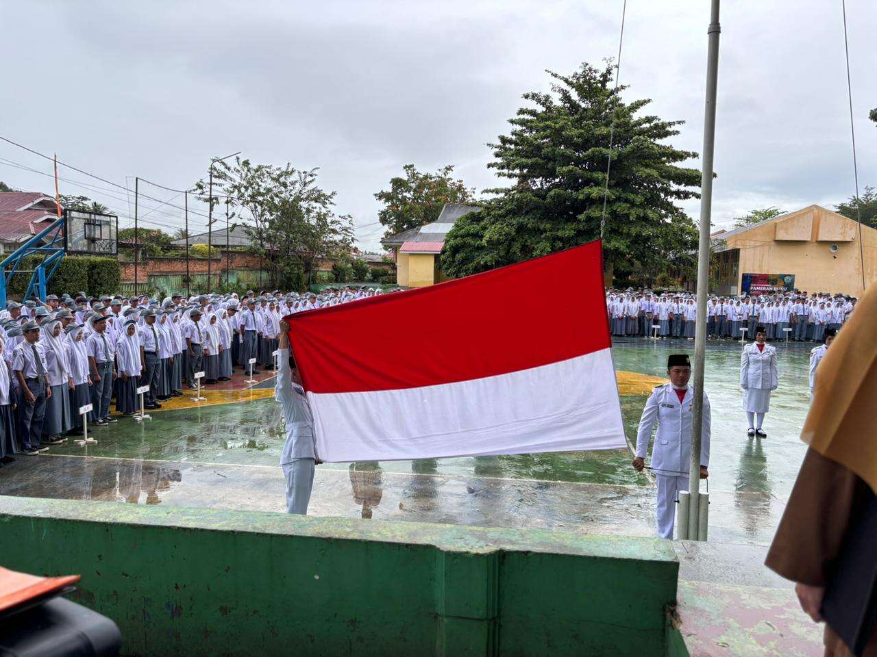 Seluruh rangkaian kegiatan berjalan lancar, mulai dari pengibaran bendera, pembacaan amanat, hingga penghormatan kepada para guru. Meskipun cuaca kurang bersahabat, semangat kebersamaan tetap menguatkan suasana peringatan.